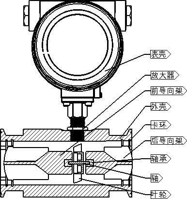 圖所示為渦輪流量傳感器結(jié)構(gòu)簡圖,由圖可見,當被測流體流過傳感器時,在流體作用下,葉輪受力旋轉(zhuǎn),其轉(zhuǎn)速與管道平均流速成正比,葉輪的轉(zhuǎn)動周期地改變磁電轉(zhuǎn)換器的磁阻值。檢測線圈中的磁通隨之發(fā)生周期性變化,產(chǎn)生周期性的感應電勢,即電脈沖信號,經(jīng)放大器放大后,送至顯示儀表顯示。