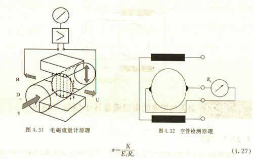 非滿管檢測也是基于電導率檢側的方法。在圖4.33所示的電磁流量傳感器中,增加了一個(或一對)非滿管檢測電極。當導管內液體滿管時,頂部電極與其他電極之間的電阻值很小;而當存在非滿管情況時,頂部電極與導電液體之間有氣體阻隔,所以電極電阻顯著增大,從而做出非滿管判斷。