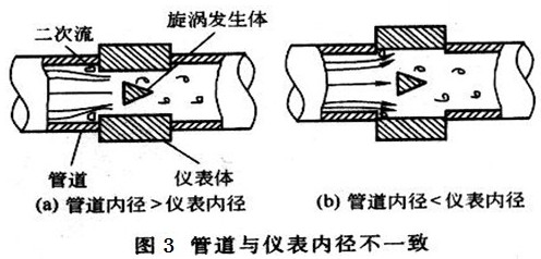 而丙烷流量計與安裝管道內徑也會存在誤差,或大或小,如圖3所示,當被測介質經過時,也會發生二次流動,對測量結果產生波動影響。