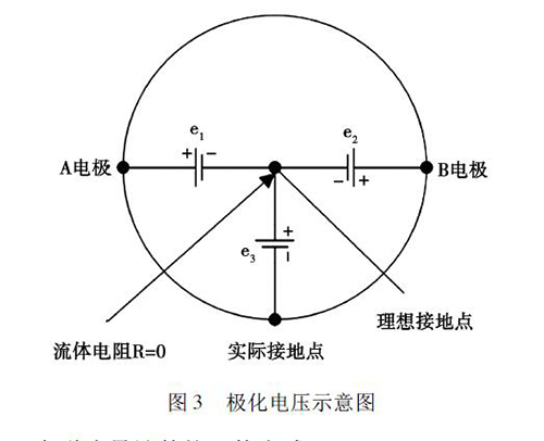 在被測液體與電極和接液部件接觸過程中,電解質中的正負離子會分別作定向運動,這會使被測液體在電極和接液部件之間形成電位差,通常將這種現象稱為極化現象。如圖3 所示,理論上來說,兩電極A 和B 對接液部件的電位e1、e2大小相等、方向相反,此時兩電極的電位差等于零。但是,若兩電極的材質或表面狀態存在差異,此時A、B 電極之間的電位差就不為零,這就形成了極化電壓,極化電壓與共模狀態的電壓e3一起疊加在流量信號中,被輸入轉換器的差動放大器。當極化電壓過大,則會對差動放大器的輸入端造成較大影響,導致信號無法放大或流量信號的輸出波動過大,從而降低了衛生型卡箍電磁流量計的測量精度。
