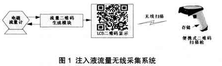 二維碼生成模塊定時向測液體流量計發(fā)送采集指令,后者收到指令后發(fā)送流量數(shù)據(jù)。