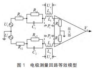 測量電極與流體介質接觸時會發生電化學反應在電極-溶液界面形成阻抗,通常由法拉*阻抗與雙電層電容并聯組成。 法拉*過程分為電荷傳遞過程和擴散過程,相應的法拉*阻抗由電荷傳遞電阻與擴散阻抗串聯組成。一般硫酸鐵流量計的勵磁頻率大于1Hz,而擴散阻抗發生在更低頻率內,不考慮擴散過程,電極等效阻抗為電荷傳遞電阻與雙電層電容并聯后再與電極接觸電阻串聯。 基于電極阻抗建立的電極等效測量回路如圖 1 所示。圖中:Rs1 和 Rs2 為電荷傳遞電阻;C1 和 C2 為雙電層電容;Rt為兩個測量電極間的接觸電阻滿足 Rt=Rt1+Rt2;Lx 為勵磁線圈等效電感;L1 為閉合回路等效電感;R1 和 R2 為放大器輸入電阻;P1和 P2 為由“變壓器效應”疊加在測量電極上的微分干擾;U1 為流體切割磁力線產生的感應電勢;Ue 為勵磁電壓。 假設磁感應強度由勵磁電流決定且成正比關系即 B=aI,忽略串模等干擾則電極間電壓為感應電勢與微分干擾的疊加,基本方程如下:
