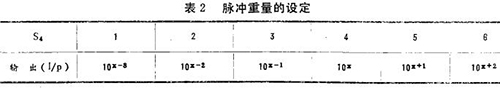 脈沖重量設定用S4插頭選擇進行,它的設定有一定的條件,這些條件是脈沖輸出的類型、脈沖寬度和刻定常數(shù)。并且它的選擇范圍還要依據(jù)脈沖寬度和*大測量流量-口-口口-l0的X方(m3/h)來確定。其系數(shù)-(數(shù)字同*大流量m3/h)由*大流量的前三位有效數(shù)定決定,而對應于“x”值的脈沖重量(l/p)見表2。