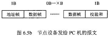 在測水流量計等節點設備和C機通信的過程中,由地址幀、命令幀、數據幀、校驗和可組成各種功能不同的報文。由于采用主從工作方式來實現通信,測水流量計等節點設備僅能接收并執行PC機發送來的控制命令,而不能發送命令給PC機。因此,由PC機發往流量計等節點設備的報文一般包括一個地址幀,一個命令幀,若干個數據幀和一個校驗和,其報文格式圖.6a5所示;而由流量計等節點設備發往PC機的報文一般包括一個地址幀,若干個數據幀和一個校驗和,其報文格式如圖6.5b所示。