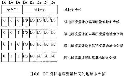 由于RS一485電氣標準規定每段只能聯結犯個節點設備,因此可用地址幀中五個二進制位表示這32個地址,其余3位用來表示命令,從而構成地址命令幀。對于控制命令需求不超過八個的通信系統,采用地址命令幀可壓縮報文長度提高通信效率。在污水網絡監控系統中,測水流量計和PC機通信的主要目的是將流量計中的有用數據讀到PC機中。這些數據包括:總累積流量、正向累積流量、反向累積流量、瞬時流量。通信時,PC機只需向測水流量計發送讀總累積流量、讀正向累積流量、讀反向累積流量、讀瞬時流量命令即可,因此二者間通信所用的地址幀和命令幀可合二為一,用一個地址命令幀代替。PC機和測水流量計間的地址命令幀定義如圖.66所示。根據污水網絡監控系統中PC機與測水流量計間通信的特殊性,二者通信所使用的報文可簡化為圖.67的格式。