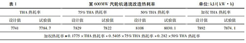 隨著火電機組利用小時數降低,發(fā)電企業(yè)一般都會根據不同負荷工況下的實際運行小時數,確定機組熱耗率考核權重,形成*終的加權熱耗率考核值。考核加權熱耗率對設備廠家末級葉片選型、高壓調門與高壓缸匹配性提出了更高的要求,在當前負荷率偏低的情況下增強了發(fā)電企業(yè)的競爭力。然而,僅僅對加權熱耗率進行考核是不夠的,設備廠家為了增強自身的競爭力,往往會把全部重點放在如何降低占比大的低負荷熱耗率上而犧牲高負荷的熱耗率,這無疑削弱了發(fā)電企業(yè)的適應性。某廠一臺 600MW 汽輪機通流改造時僅對加權熱耗率進行考核,THA 熱耗率要高出設計值43. 7 kJ/( kW·h) ,詳見表 1。通流改造時既要對加權熱耗率進行考核,也要對 THA工況時熱耗率進行考核。