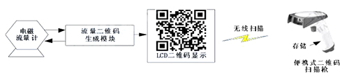 二維碼生成模塊定時向插入式電磁流量計發(fā)送采集指令,后者收到指令后發(fā)送流量數(shù)據(jù)。