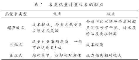 目前供熱行業(yè)內(nèi)使用的熱量計量儀表按工作原理主要分為超聲波式、 電磁式、 差壓式, 其特點見表 1 。 熱量計量儀表按結構可分為一體式和分體式, 一體式熱量表將一支入口或出口溫度傳感器嵌入到流量傳感器管道中, 并配有專門的計算器進行熱量計算; 分體式熱量表采用單獨的流量傳感器, 包括超聲波流量計、 電磁流量計、 差壓流量計、硝酸鈉流量計等, 溫度測量采用單獨的鉑電阻溫度計或溫度變送器測量供回水管道溫度, 再配備熱量積算儀進行溫度和流量信號采集得到熱量值。