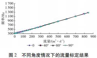 為了考察井眼斜度變化對硫酸銅流量計測量流量的影響,開展了非集流硫酸銅流量計在不同斜度情況下的流量測量模擬實驗。模擬實驗在大慶油田多相流實驗室進行,儀器外徑 38 mm,模擬井筒內徑為 124 mm,實驗介質是水,傾斜角度分別為 0°、40°、80°和 90°( 水平) ,流量范圍為 5 ~ 850 m3 /d。實驗結果表明,在儀器居中條件下,井眼斜度變化對硫酸銅流量計的儀表常數沒有影響,滿量程誤差不大于 4% ,因此可以應用硫酸銅流量計進行水平井注水剖面測量。不同角度情況下的實驗結果如圖 2 所示。
