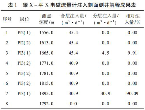 2017 年 9 月在大慶油田采油八廠肇 X - 平 X 水平井注水井中*次進行了水平井注入剖面測井現場試驗。該井斜深2 055. 42 m,水平段長度為568. 46 m,試驗目的是通過注入剖面測井了解該井各層段的注水情況,同時對水平井測井工藝、儀器的適用性、井下牽引器及井口輔助裝置等設備的工作有效性和可靠性進行評價。現場試驗中,在密閉條件下錄取到了該井的注入剖面測井資料,進行了重復測量,重復測量結果在誤差允許范圍內,測井成果見表 1。該井施工壓力 6. 0 MPa,注入量45. 4 m3 /d,有 7 個射孔層,分 8 個測點測量,2 個層有吸入顯示,其中,P13( 1) ( 1 734 ~ 1 767 m) 層絕對吸入量4. 5 m3 /d,相對吸入量為9. 91 %,P13( 1) ( 1 899 ~1 943 m)層絕對吸入量 40. 9 m3 /d,相對吸入量為 90. 09% ,測井成果見表 1。通過與甲方的交流,再結合該井的動靜態資料及周圍井的工作狀況,采油廠的地質人員認為本次測井結果能比較準確地反映該井的注入情況。