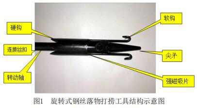 (1)一體式渦街流量計結構設計合理,旋轉機構實現了井下鋼絲在鉤身上的纏繞,軟硬鉤配合設計實現鋼絲的多角度打撈,強磁片的設計實現了小物件落物的一次性打撈,也防止了短小鋼絲落物的再次出現。