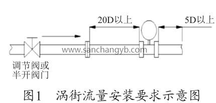 根據(jù)圖1渦街流量安裝要求示意圖及廠家的設備說明書要求,流量計上游的直管段長度至少為20D≈1 600mm,下游的直管段至少在5D≈400mm,D=80mm 為管道直徑。圖2為現(xiàn)場安裝圖,流量計上游僅為600mm <1 600mm,此流量計安裝位置有誤,對測量值有一定的影響,造成測量偏差,需調(diào)整流量計的安裝位置。