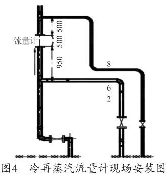 根據(jù)圖1渦街流量安裝要求示意圖及廠家的設備說明書要求,流量計上游的直管段長度至少為20D≈1 300mm,下游的直管段至少在5D≈325mm,D=65mm 為管道直徑。圖4為冷再蒸汽流量計現(xiàn)場安裝圖,流量計上游僅為950mm<1600mm,此流量計安裝位置有誤,對測量值有一定的影響,造成測量偏差,需調(diào)整流量計的安裝位置。