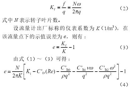 式中q表示體積流量,m3/s;ν表示介質的運動黏度,m2/s;雷諾數Re=4q/(πdν);d表示流量計口徑,m;ρ表示介質的密度,kg/m3;C'D、C'B0、C'B1和C'B2分別表示4個待定系數,在某個流量點下標定出的儀表系數(Kf,表示單位體積流體通過流量計時,流量計輸出的脈沖數,1/m3)和轉子葉片頻率(f,s-1)的關系為: