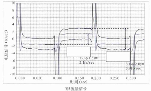 舉例,如圖5所示,線圈采用5Hz驅(qū)動(dòng)時(shí)的0feet/s,3.1feet/s,5.9feet/s流速下的電極信號(hào),利用上述方法對(duì)信號(hào)進(jìn)行處理并計(jì)算流速。取每半波*后的20%納入流速計(jì)算,正半波與負(fù)半波相減即是流速。如3.1feet/s–(-2.8feet/s)=5.9feet/s,雖然有+0.15 feet/s的直流偏置,但也不影響流速的計(jì)算。因線圈是5Hz驅(qū)動(dòng),半波的20%是20ms,正好是1個(gè)完整的工頻周期,這樣就不受工頻干擾的影響。正半波與負(fù)半波相減,這樣就避免了直流偏置和共模干擾的影響。再加上在數(shù)字濾波過(guò)程中使用限幅濾波和算數(shù)平均,保證了流量信號(hào)的有效提取。