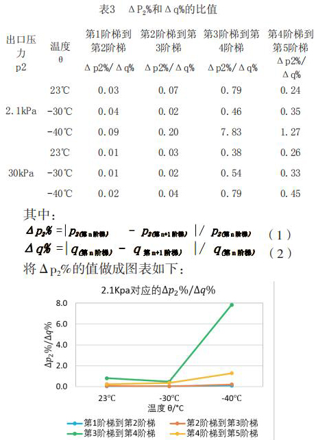 為了更直觀嚴謹的對比每個階段響應速度的不同,對原始數據進行處理,得到如下表格2和表格3。將△p2%/△q%作為響應速度的直觀量化表達,若△p2%/△q%的值大,說明單位流量變化照成的出口壓力變化大,即說明電磁流量計響應相對較慢,反之亦然。