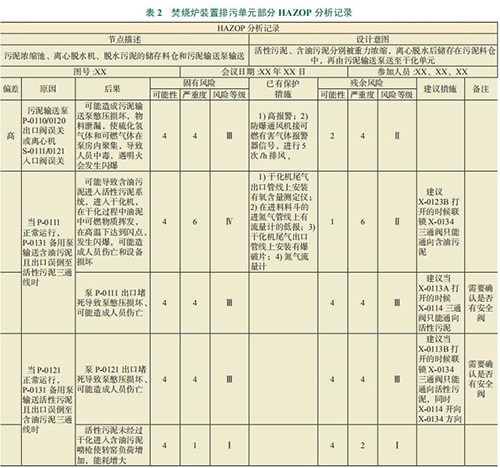 本次分析組的主要人員有:企業氫氣流量計分析組以及焚燒爐裝置工藝工程師、設備工程師、儀表工程師、安全工程師和操作班組長。本次分析主要依據公司級相關標準和規范:《健康安全環境風險標準》以及《危險與可操作性分析(氫氣流量計)規范》,并于 1 個月內對焚燒爐裝置進行了分析,發現了部分重大的風險和隱患。按建議措施對應的風險等級劃分,其中包括:Ⅳ級嚴重風險(限期整改強制性措施);Ⅲ級高度風險(限期整改強制性措施);Ⅱ級中度風險(期望改進推薦性措施);Ⅰ級可接受風險(建議性措施)。本報告僅逐一列出部分較高或容易忽視的風險(其他在氫氣流量計分析的記錄中體現)。評估發現:本次分析評估共發現三級風險 25 項(類),其中排污單元三級風險 2 項(類)。其中,焚燒爐裝置排污單元分析記錄內容如表 2 所示。