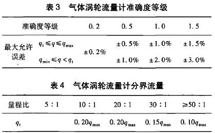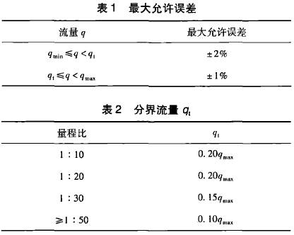 在GB21391--2008《用天然氣渦輪流量計測量天然氣流量》對分界流量q,有明確的定義,即低于該流量要采用擴展誤差限的流量值。標準*5.2條從*大允許誤差和量程比兩方面對分界流量做出了規(guī)定,且明確了量程比是在*大允許誤差范圍內(nèi)流量計的*小流量和*大流量之比。該標準中對渦輪流量計要求的*大允許誤差如表1所示,量程比與分界流量q,的關(guān)系如表2所示。