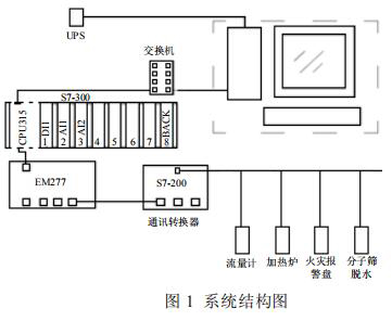 集氣站是收集氣井所生產(chǎn)天然氣的站場,在集氣站內(nèi)對天然氣進(jìn)行節(jié)流降壓、加熱、調(diào)壓計(jì)量等各種工藝預(yù)處理,設(shè)備眾多且分散。為方便進(jìn)行檢測和操作,必須進(jìn)行統(tǒng)一的數(shù)據(jù)采集,在監(jiān)控臺(tái)進(jìn)行數(shù)據(jù)的管理。集氣站設(shè)備主要包括加熱爐、衛(wèi)生型渦輪流量計(jì)、分子篩、火災(zāi)報(bào)警盤,以及供電設(shè)備 UPS 等,這些不同廠家的設(shè)備基本都支持Modbus 協(xié)議,通過 Modbus 通訊可以將這些數(shù)據(jù)采集。為了有效降低成本,設(shè)計(jì)了如圖 1 所示的系統(tǒng)。系統(tǒng)采用西門子 S7-300 控制器,通過以太網(wǎng)連接上位機(jī)監(jiān)控軟件,再通過 MP277 連接S7-200 的方式。S7-200 控制器自帶 RS485 接口,能夠進(jìn)行 Modbus 通訊,采集現(xiàn)場各種設(shè)備數(shù)據(jù)。*后通過以太網(wǎng)通訊將設(shè)備數(shù)據(jù)上傳至監(jiān)控軟件,方便操作人員進(jìn)行監(jiān)控,該方案簡單有效,能夠?qū)崿F(xiàn)集氣站內(nèi)設(shè)備的狀態(tài)監(jiān)控,數(shù)據(jù)處理,有效的進(jìn)行天然氣的生產(chǎn)工作。