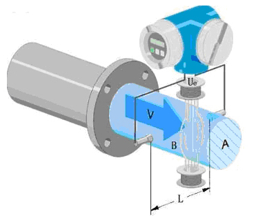 式中 K 、 d 為常數,由于勵磁電流是恒流的,故 B 也是常數,則由 E=KBdv 可知,流體流量 Q 與電壓信號 E 成正比,即流速感應的信號電壓 E 與體積 Q 成線形關系。因此只要測量 E 就可以確定 Q ,這就是污水流量表的基本原理。