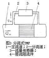 為了獲得良好的線形輸出,必須保持層流流動(dòng),測量管內(nèi)徑d設(shè)計(jì)得很小而長度l很長,即有很大l/d比值,流速低,流量小。為擴(kuò)大儀表流量,還可采用在管道內(nèi)裝管束等層流阻流件;擴(kuò)大更大流量和口徑還常采用分流方式,在主管道內(nèi)裝層流阻流件(見圖3)以恒定比值分流部分流體到流量傳感部件。有些型號儀表也有用文丘里噴嘴等代替層流阻流件。