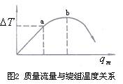 在總的熱傳導(dǎo)系數(shù)a中,因測量管壁很薄且具有相對較高熱導(dǎo)率,儀表制成后其值不變,因此a的變化可簡化認(rèn)為主要是流體邊界層熱導(dǎo)率的變化。當(dāng)使用于某一特定范圍的流體時(shí),則a、cp均視為常量,則質(zhì)量流量僅與繞組平均溫度差成正比,如圖2 oa 段所示。 oa段為儀表正常測量范圍,儀表出口處流體不帶走熱量,或者說帶走熱量極微;超過a點(diǎn)流量增大到有部分熱量被帶走而呈現(xiàn)非線性,流量超過b點(diǎn)則大量熱量被帶走。